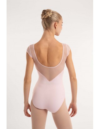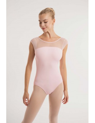 Justaucorps pour jeunes danseuses à manches courtes avec empiècement en tulle stretch en transparence sur l'encolure et le dos.