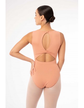 Ce justaucorps sans manches se distingue par son encolure ronde et son dos doublement ouvert, sublimé par un élégant détail de nœud croisé. Il se ferme à l’aide d’un bouton pression discret (agrafe), offrant maintien et facilité d’enfilage. Doublure douce sur le devant pour un confort optimal.