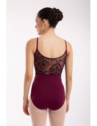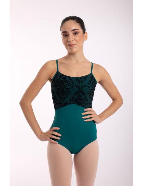 Justaucorps bretelles fines avec joli empiècement en mesh stretch avec décors en velours noir.