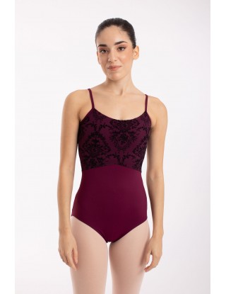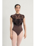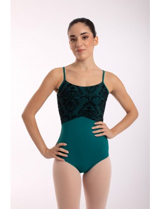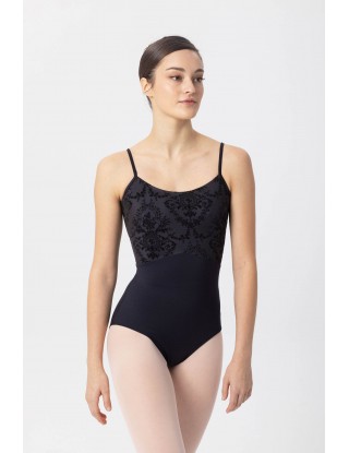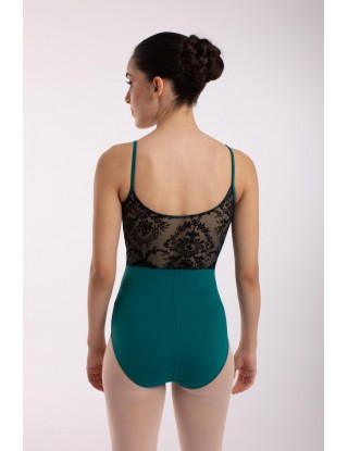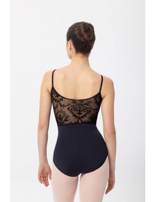 Justaucorps bretelles fines avec joli empiècement en mesh stretch avec décors en velours noir.