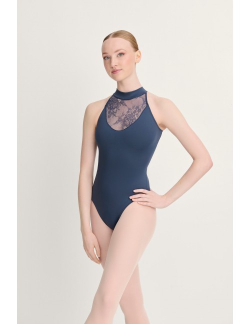 Ce justaucorps dos-nu présente une encolure haute ornée de délicats empiècements en dentelle assortie à l’avant et dans le dos. Il se ferme élégamment au cou à l’aide d’agrafes, tandis que le dos froncé met en valeur la silhouette. Doublure douce sur le devant pour un confort optimal.