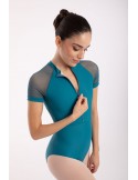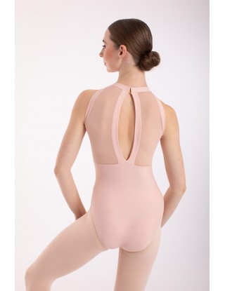 Justaucorps col officier, sans manche avec empiècement en tulle stretch et ouverture dans le dos. Fermeture au col.