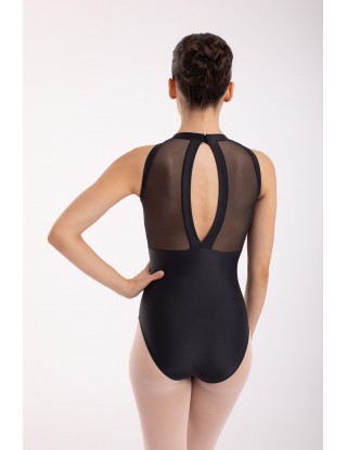 Justaucorps col officier, sans manche avec empiècement en tulle stretch et ouverture dans le dos. Fermeture au col.